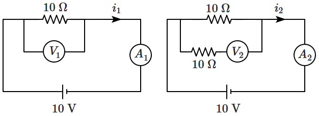 In the circuits shown below, the readings of the voltmeters and the ammeters will be: