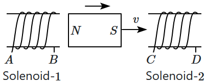 An electron moves on a straight-line path as shown. The is a coil adjacent to the path of electrons. What will be the direction of current if any, induced in the coil?