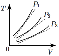 The following graph represents the curves of an ideal gas (where is the temperature and the volume) at three pressures and compared with those of Charles's law represented as dotted lines.