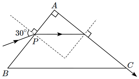 Find the value of the angle of emergence from the prism given below for the incidence ray shown. The refractive index of the glass is .